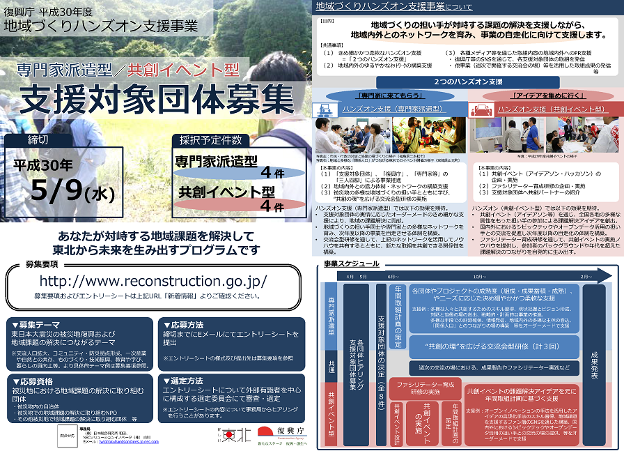 平成30年4月12日から、平成30年度「地域づくりハンズオン支援事業」支援対象団体の募集を開始します。