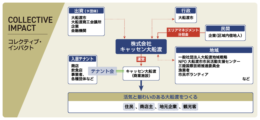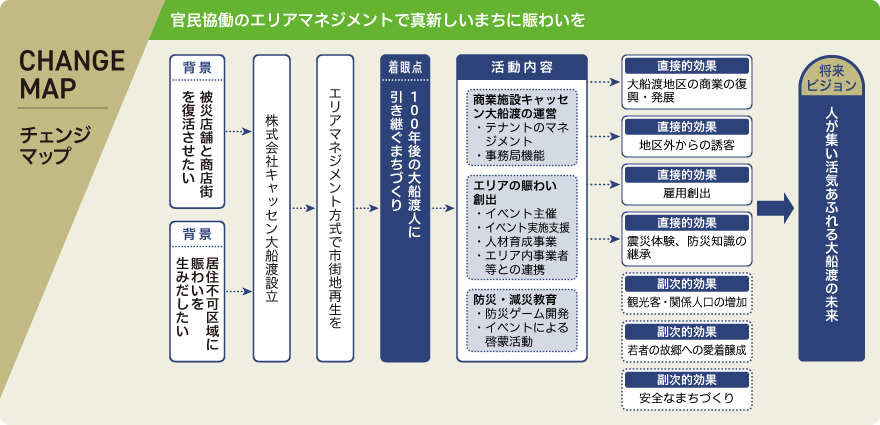 地区の再生には、新たに設立するまちづくり会社がテナント運営や賑わい創出を担う「エリアマネジメント」方式を導入した。活動資金の創出にはこれまでにない手法を取った。区域内の市有地に進出する企業に対して市が地代を通常より大幅に減額し、企業は減額分をエリアマネジメント分担金として拠出。まちづくり会社はこの分担金と、新設する商業施設テナントの賃料を運営資金として活用する仕組みだ。2014年、会社の前身となる「大船渡駅周辺地区官民連携まちづくり協議会」が発足、2015年に株式会社キャッセン大船渡が設立された。出資したのは大船渡市と大船渡商工会議所、企業、金融機関の合計9団体。代表取締役には当初、暫定的に戸田公明市長(当時)が就いたが、2016年3月に地元で会社を経営し人脈も幅広い田村滿さんが引き継いだ。