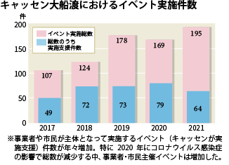 他にも市民参加型の緑化活動や、子育て中の母親向けイベントなど、地域コミュニティを育て広げる活動を実施する。地元の夏まつりに合わせて開く「キャッセンのなつまつり」、アウトドアと防災、野外ライブを掛け合わせた「ソナエマチモリ」、地元漁業者による「ホタテふぇすた」など規模の大きなイベントも開く。これらのエリアマネジメント事業は高く評価され、2017年に日本都市計画家協会「日本まちづくり大賞」、2021年度は総務省「ふるさとづくり大賞・団体表彰」を受賞した。