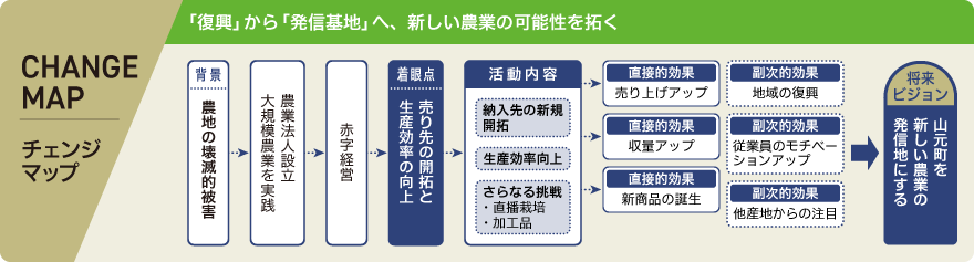 平坦な土地に広がる農地が壊滅的な被害を受けた宮城沿岸最南端のまち、山元町。2015年、農業の再生を目指して100haという広大な農地に機械化・IT化を整備し、農業法人が設立された。しかし思うように業績が上がらず、赤字が続く。そこで経営改革を託されたのが、JA全農みやぎ職員として再生計画の立案に携わった馬場仁さんだった。