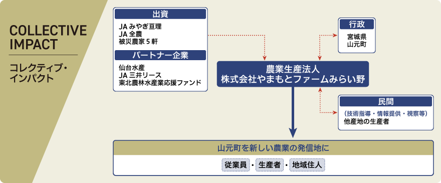 山元町の農業再生を目的に法人を立ち上げるにあたり出資者となったのは、JAみやぎ亘理、JA全農、被災農家5軒、パートナー企業として仙台水産とJA三井リース、東北農林水産業応援ファンドだ。約500軒の地権者は避難等で散り散りになっており、探し出して合意を取り付けるのは大変な苦労があったという。事業計画作成については山元町、宮城県が協力し、JA全農みやぎが主導した。資金はJA全農みやぎから災害積立金などの援助と、国の東日本大震災農業生産対策交付金等を活用した。