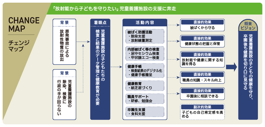 澤田さんの活動の端緒は青葉学園との縁だ。澤田さんは2011年8月同園を訪ね、当時の神戸信行園長と「6時間ぶっ通しで語り合った」と振り返る。制度の狭間で十分な支援を受けられない子どもたちの窮状に耳を傾け、施設職員の不断の努力を目の当たりにし、仕事をなげうってでも活動を始めようと決意した。「神戸園長とキリスト教の信仰を同じくしていたことで、近しく思ってもらえたのかもしれません」と澤田さん。後に甲状腺エコー検査や、健康手帳システムの開発の際に支援の手を差し伸べたのもそれぞれキリスト教関係団体だった。中でもシステム開発事業はNPOと企業の協働事例として高く評価され、日本パートナーシップサポートセンター主催の「第11回パートナーシップ大賞優秀賞」を受賞した。