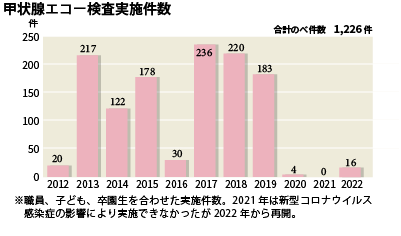法人として最初に取り組んだのは、施設敷地の線量測定と子どもの内部被ばくを調べるための尿中セシウム検査だ。その後、福島県では事故当時18歳以下だった子ども全員の甲状腺エコー検査実施が決まったが、児童養護施設入所者の住民票は親元にあるためほとんどの場合、案内が届かなかった(関係者の努力により、後に制度は改善された)。同様に外部被ばく量測定用の個人線量計も届かなかった。施設の子どもが取り残されてはならないという思いに、公益社団法人日本キリスト教海外医療協力会が応え資金を援助。甲状腺エコー検査は、超音波診断装置を購入して順次検査を実施し、個人線量計も配布した。エコー検査への子どもたちの不安を少しでも払拭するため、甲状腺がからだのどこにあるか、形状、働き、がんの早期発見・治療のために検査が必要なことなどを紙芝居に仕立て、子どもに説明した。検査前に説明するのは職員、検査直後には結果を見ながら医師、看護師、検査技師が説明した。