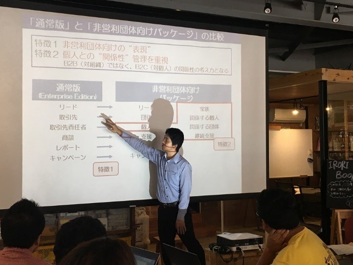 セールスフォースの基本的機能紹介や、実際に導入した非営利団体の活用例、基礎データの登録方法などについて、講義と演習を行った。既に導入している非営利団体からは、カスタマイズの方法など実際の業務に対応させるための具体的な質問が上がった。