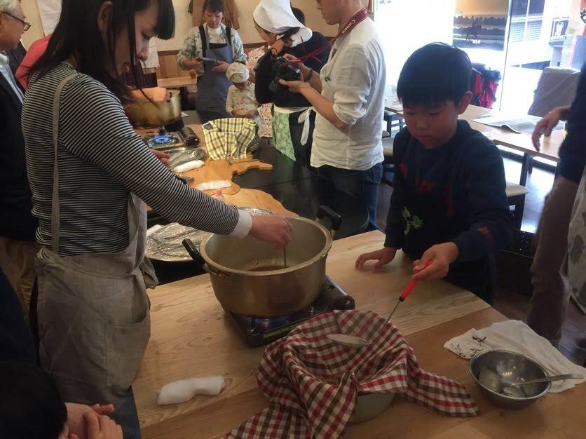 最初に平塚氏よりフィッシャーマンズ・リーグと「三陸」の説明(震災を契機につながりができた連携プロジェクトチームであること、世界三大漁場であること、三陸の漁場がなぜ良いのか、それに関わる三陸の人々がどんな仕事をしているのか等)を、プロモーションムービーを投影しながらお話しいただきました。次に赤間氏から、藻塩づくりの流れと今回使用する福島や宮城の食材(わかめ、牡蠣、海苔、「てんのつぶ」のお米、相馬の伝統野菜等)について説明したあと、会場中央に集まってみんなで大きな鍋に海水とスーパー海藻といわれるアカモクをいれて、煮込みました。三陸の象徴である「牡蠣」と「わかめ」のドキュメントムービーを見ながら待つこと20分、塩の結晶が少しずつできてきて、会場からは驚きの声があがりました。藻塩を鍋から取り出した後、調理場から三陸の金華サバが登場。子供たちができた塩を金華サバにぱらぱらふりかけた後、焼きました。その後、福島のGI認証を取得したカトウファームのお米「てんのつぶ」と宮城県東松島市の海苔漁師の相澤 太氏の皇室献上の海苔で、塩むすびを作りました。赤間氏が差し入れてくださった海藻の佃煮4種も加わって、とても豪華なクッキングになりました。クッキング終了後は、会場中央でそのまま食事をしました。ランチには気仙沼の「もまれ牡蠣」や福島県相馬市の伝統野菜「相馬土垂」も登場して、藻塩で三陸と福島の食をつなぎ、様々な生産者の顔や三陸を紹介することができました。