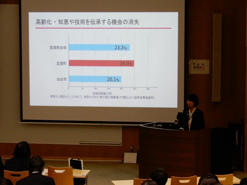 女性が活躍できる職場の創出について、亘理町の現状を踏まえて、震災後にWATALISを起業した経緯と信念についてお話しいただきました。着物について生徒が実際に着用することで日本古来の文化に触れる機会を設け、身近になった着物をリユース、リサイクルすることで、廃棄物や使用しなくなったものなどを新しい素材やよりよい製品に変換して価値を高めるアップサイクル文化の醸成を実感できる内容でした。