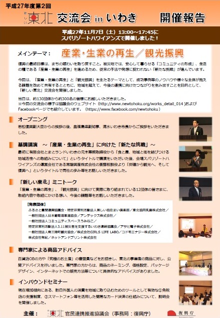 平成27年11月7日(土)に「新しい東北」フォーラムinいわきを福島県いわき市のスパリゾートハワインアンズにて開催しました。当日は、基調講演や企業・団体の方によるミニトーク、専門家による商品アドバイスやインバウンド消費の取り込みに向けたセミナーの実施、33の企業・団体の取組を紹介いただくブース展示を行い、約130団体から約300名の方にご来場いただきました。