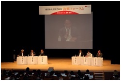 フォーラム第一部では、「岩手県・宮城県・福島県知事の鼎談」「復興支援ミニコンサート」を行いました。フォーラム第二部では、伊藤元重学習院大学教授をファシリテーターとし、復興に携わってきた各界の有識者が、この5年間の経験や得られた様々な教訓を伝えるとともに、被災地が抱える復興の課題への対応策や、これからの復興・創生に向けて積極的に取り組んでいきたいことについて活発なディスカッションを行いました。