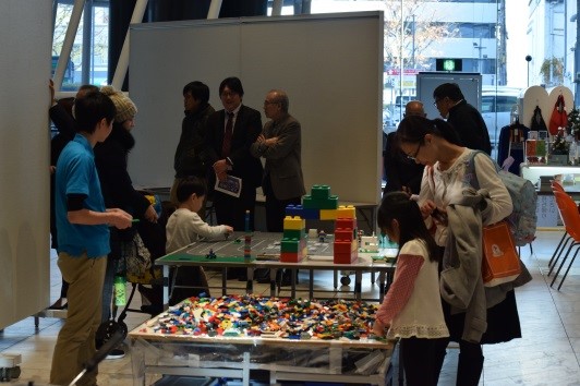 未来の建築や乗り物を想像しながら自由に制作し完成したものをブースに飾ります。ひとり一人の作品が集まり、大きな未来のまちになっていきました。